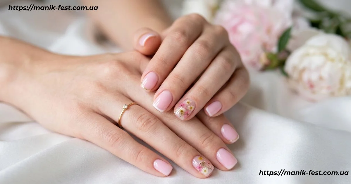 Квіткові візерунки – це абсолютна класика, яка перетворює звичайний манікюр на День матері у справжній весняний витвір мистецтва. Якщо ви цінуєте делікатність, зверніть увагу на сухоцвіти, які майстер обережно вкладає під прозоре покриття. Такі дрібні суцвіття на нігтях створюють неймовірний об’ємний ефект та виглядають натурально.