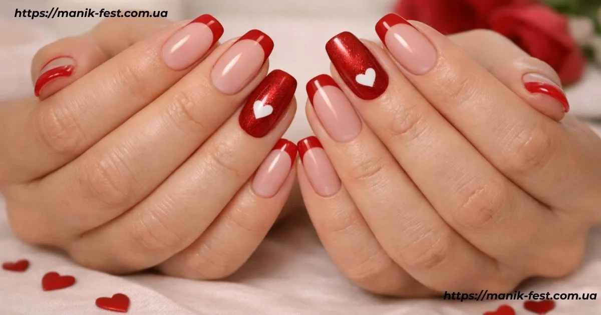 Серця залишаються одним із найпопулярніших елементів у романтичному нейл-арті. Їх наносять у вигляді дрібних акцентів, мінімалістичних контурів чи комбінують із френчем та однотонним покриттям. Найчастіше такий дизайн виконують у червоно-білій або рожевій гамі, щоб святковий манікюр виглядав охайно й не перевантажено.